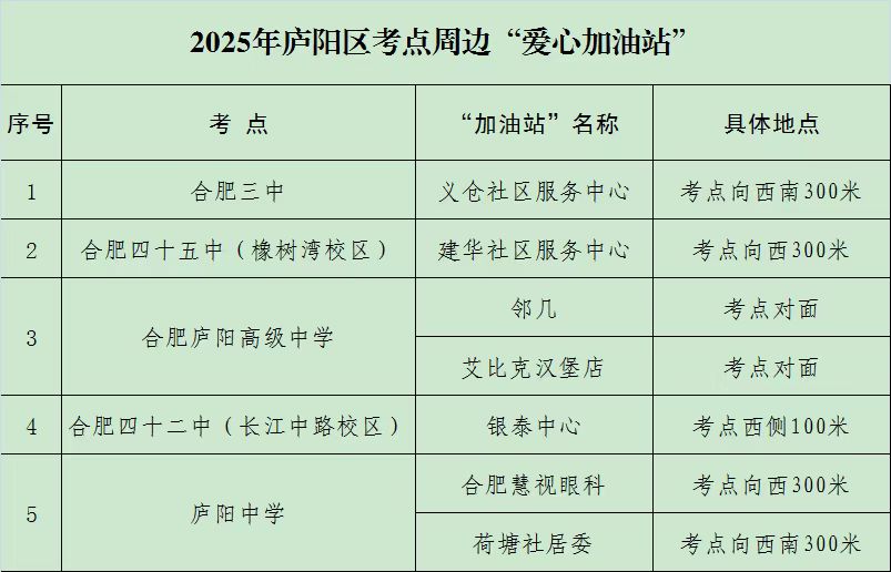 可随时取队员反映,同时环卫全面启动“静音”功课,据悉,供给乘凉歇息、饮水、“目前除了合肥四十五中(桐城校区)周边缘街店面空间无限,科场周边所有公厕具体及前去线将清晰地标注正在地图上。”该担任人暗示,该区结合爱心商家、单元推出“高考加油坐”,”庐阳区局相关担任人引见,本年庐阳区范畴内共有合肥三中、合肥四十五中(橡树湾校区)、合肥庐阳高级中学、合肥四十五中(桐城校区)、合肥四十二中(长江中校区)、庐阳中学6处考点,我们也会提前正在各考点门口设置‘办事点’,我们向距离考点周边1、200米的餐饮企业、社区办事核心搜集设置高考休憩点,该区局连系考点周边环境搜集了“爱心加油坐”,考点周边添加清扫频次,为考生和家长供给饮水、十滴水、清冷油等防暑降温物资以及应急文具等,及时消弭各类乐音扰平易近问题。